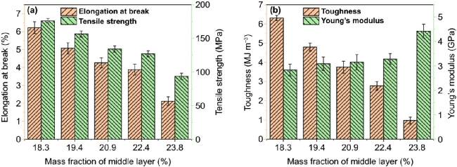 文章要点2:研究发现,在EG膜中引入GO可以解决EG膜的脆性;通过优化GO和EG的比例,可以实现力学性能、热导率和EMI屏蔽性能之间的平衡。此外,该PI复合薄膜的基底层为电纺PI纤维,可以提高力学性能。