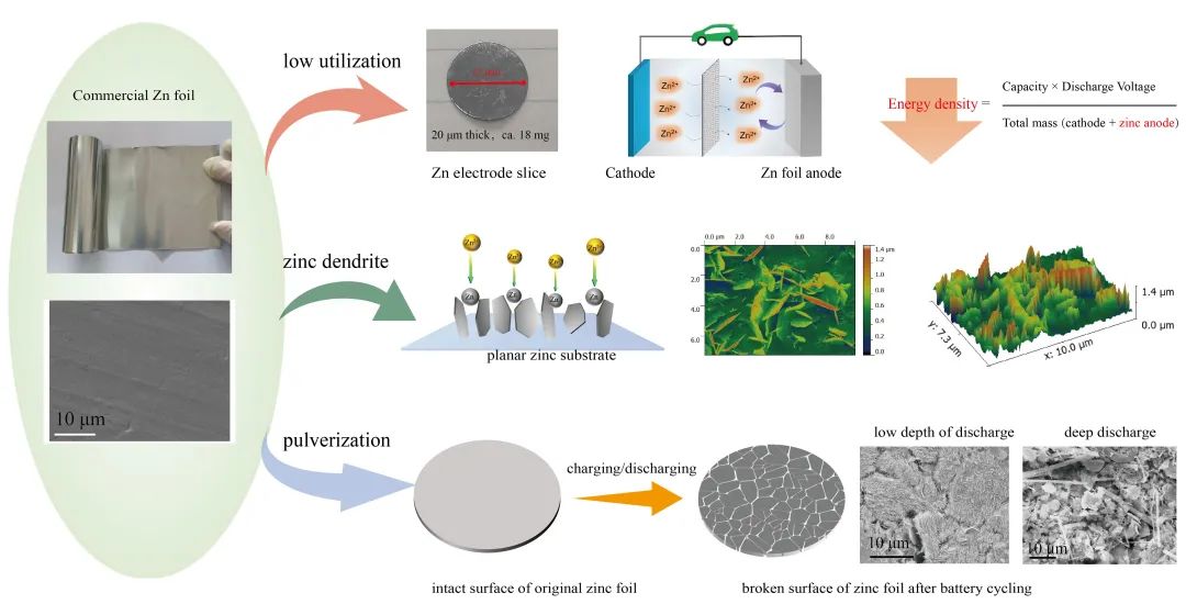 图1. 目前商用锌箔负极普遍存在的三个问题:(1)锌利用率偏低,不利于构建实用化的高能量密度全电池器件;(2)枝晶化生长严重,易诱发电池内部短路;(3)反复沉积/剥离引发电极整体粉化,导致锌电极电接触故障。