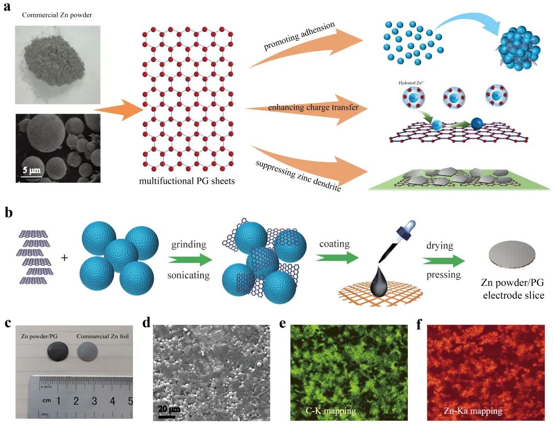 图2. PG杂合锌粉的制备工艺:(a)应用PG杂合商用锌粉实现多功能化改性锌粉负极的设计思路。(b)锌粉/PG电极片制备示意图;(c)锌粉/PG电极片的照片(直径为12 mm);(d)锌粉/PG的表面SEM图像及相应的(e)C和(f)Zn元素的EDS面分布图。
