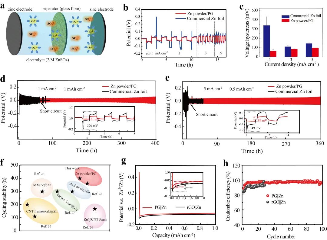 图3. PG杂合锌粉负极的电化学性能分析:(a)Zn//Zn对称电池示意图;(b)基于锌粉/PG和Zn箔对称电池的倍率性能,电流密度为1 – 5 mA cm-2,沉积面容量为1 mAh cm-2时,以及(c)不同电流密度下对应的平均电压滞后;(d)基于锌粉/PG和Zn箔对称电池的电压-时间曲线,电流密度为1 mA cm−2,面容量为1 mAh cm−2;(e)基于锌粉/PG和Zn箔对称电池的电压-时间曲线,电流密度为5 mA cm−2,面容量为0.5 mAh cm−2;(f)基于三维骨架结构负载锌金属负极的循环性能比较;(g)不对称电池体系中PG和还原氧化石墨烯(rGO)电极上的初始锌沉积曲线,电流密度为1 mA cm−2,面容量为1 mAh cm−2;以及(h)相应不对称电池的库仑效率。