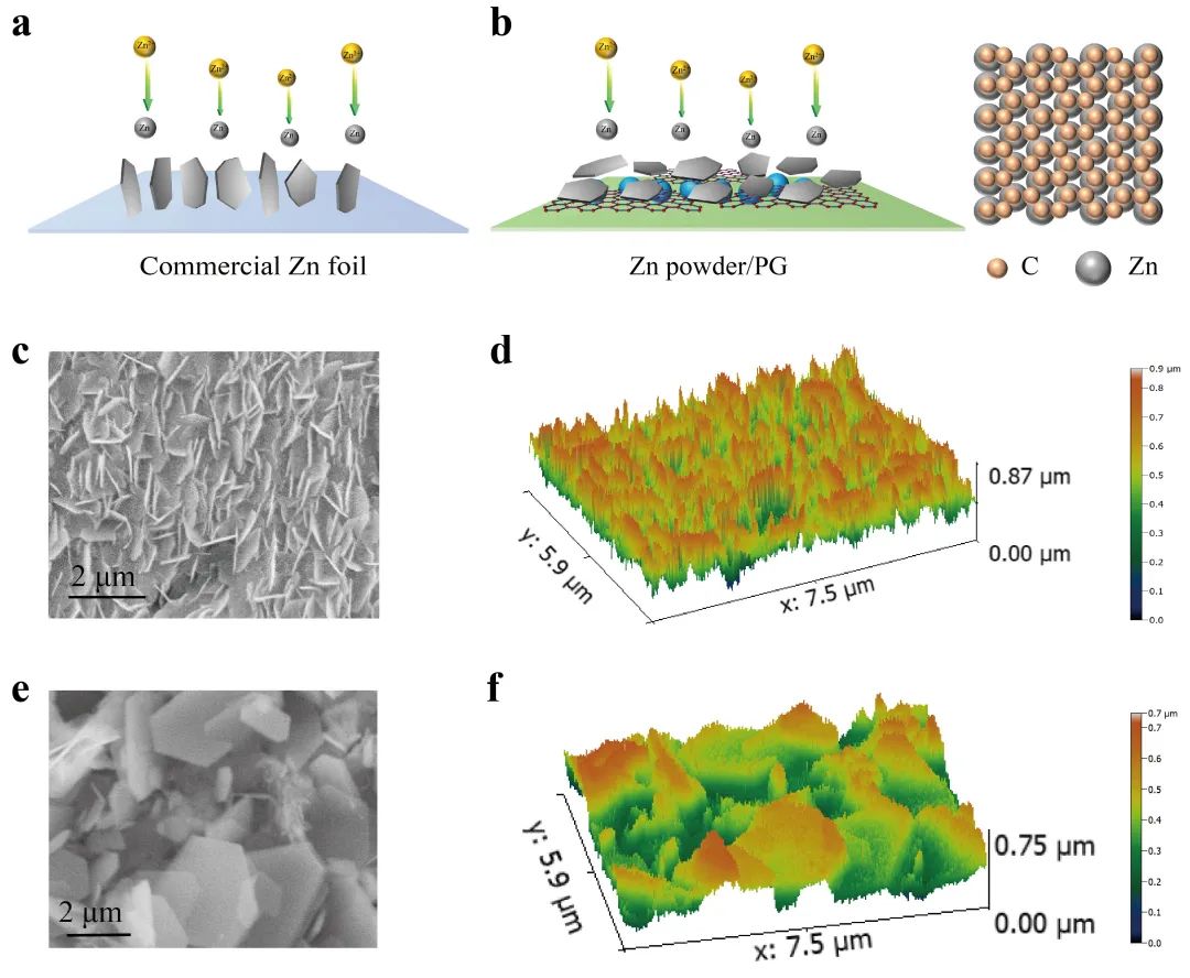图4. PG杂合锌粉负极界面锌沉积形貌分析:(a)商用锌箔界面和(b)锌粉/PG界面上锌沉积形貌示意图及相应的SEM表面图像,(c,d)锌箔界面,(e,f)锌粉/PG界面,电流密度为2 mA cm−2,面容量为0.5 mAh cm−2。