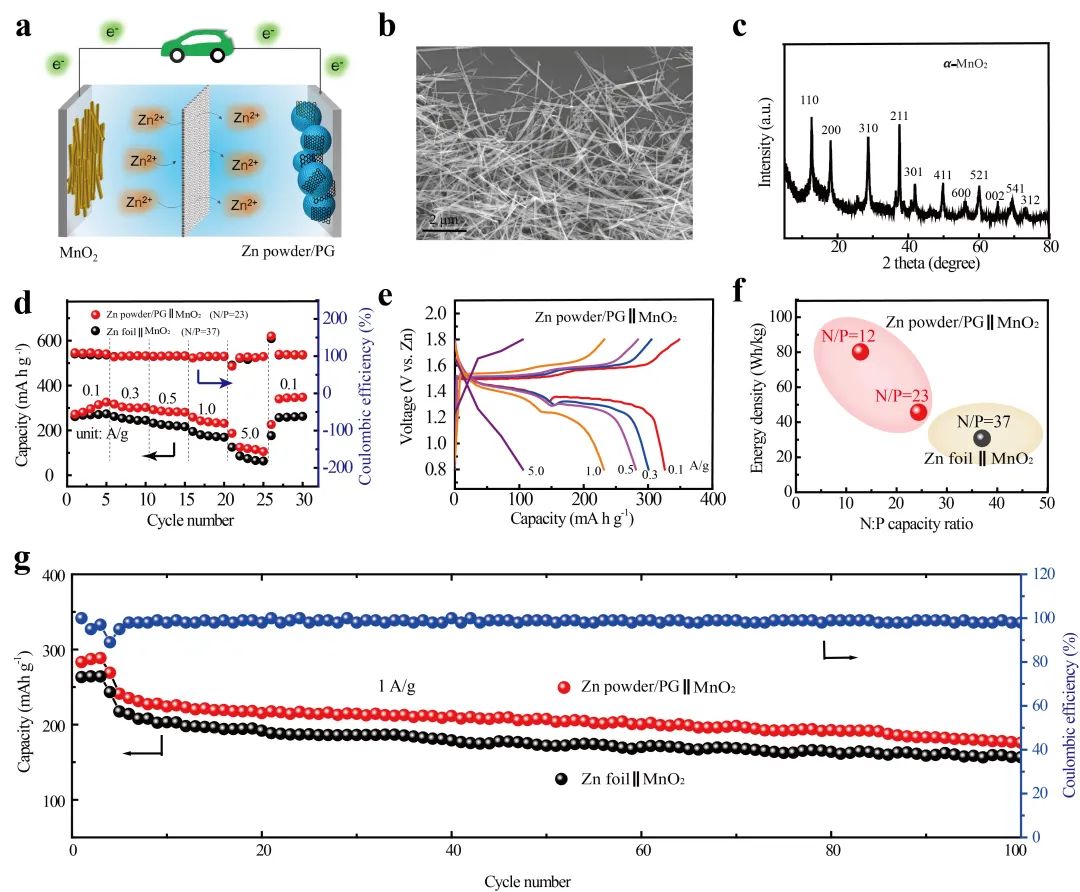 图6. PG杂合锌粉负极在全电池中的实用性能分析:(a)以Zn粉/PG为负极的Zn//MnO2全电池示意图。(b)MnO2正极材料的SEM图像和(c)对应的XRD谱图。(d)以Zn粉/PG和Zn箔为负极的Zn//MnO2全电池的倍率性能和对应的库仑效率。(e)以Zn粉/PG为负极的Zn//MnO2电池在0.1- 5 A g−1不同电流密度下的恒流充放电曲线。(f)以Zn粉/PG和Zn箔为负极的Zn//MnO2全电池的质量能量密度比较,以Zn粉/PG为负极的电池具有更低的N/P值故而能量密度更大,锌利用率更高。(g)以Zn粉/PG和Zn箔为负极的Zn//MnO2全电池的长循环性能比较。