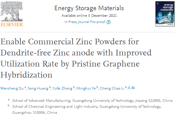 Wencheng Du, Song Huang, Yufei Zhang, Minghui Ye and C. C. Li*, Enable Commercial Zinc Powders for Dendrite-free Zinc anode with Improved Utilization Rate by Pristine Graphene Hybridization,Energy Storage Materials., 2021, DOI:10.1016/j.ensm.2021.12.007