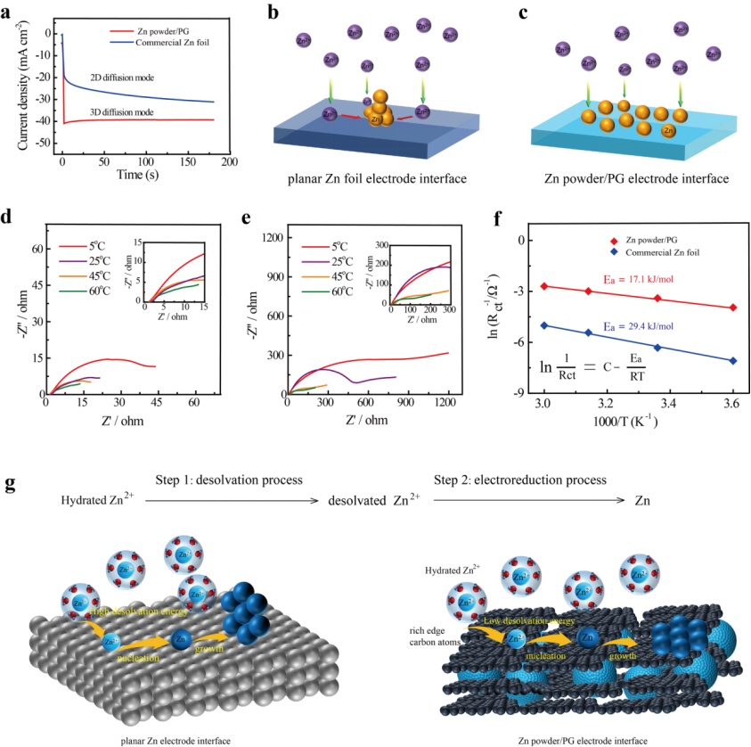 为了进一步从微观层面探讨锌沉积机理,采用计时电流法(chronoamperometry,CA)和电化学阻抗(EIS)对界面锌金属成核/生长模式和沉积动力学进行了研究(图5)。结果显示:锌箔界面上锌沉积电流随时间显著变化(图5a),表明锌沉积涉及二维平面扩散过程和不均匀的沉积生长模式(图5b)。这是由于锌箔界面上锌离子倾向于沿二维表面横向扩散,以寻找成核能垒最低的位点,锌离子的这种优先沉积倾向易引起锌聚集式沉积,诱发枝晶化生长。这种平面Zn箔负极上典型的二维无序扩散模式成为前述图4中观察到的枝晶化现象的内在原因。形成鲜明对比的是,Zn powder/PG界面上锌沉积的电流-时间曲线几乎没有变化(图5a),表明在整个电沉积过程中具有稳定的三维扩散模式。这意味着迁移到界面上的锌离子可以直接原位还原为金属锌(图5c)。这种均匀的锌沉积得益于Zn powder/PG负极独特的界面结构和电化学环境。因此,Zn powder/PG界面不存在前述图4e、f所示的枝晶化沉积模式,而是呈现沿电极平面外延生长。