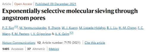 1. P. Z. Sun, et al. Exponentially selective molecular sieving through angstrom pores. Nature Communications, 2021, 12, 7170.