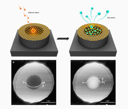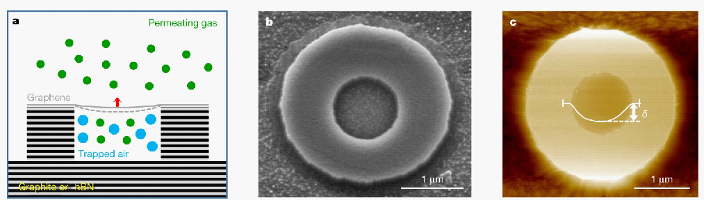 以上实验结果的成功观测源于两点原因:1)气体传输测量所用器件为高质量机械剥离石墨烯薄膜密封微米尺寸单晶石墨腔体(图2)[2],该器件具有极高探测精度,可实现对流速低至每小时若干气体分子的极弱传输过程的有效测量;2)该研究团队通过精确控制电子束的加速电压(<10 kV)和逐步照射剂量(每步低至1个电子/100nm2),在微米尺寸石墨烯薄膜中引入单个原子孔,从而有效避免引入任何其他大尺寸孔道副产物,进而呈现单个原子孔的真实分子输运特性。