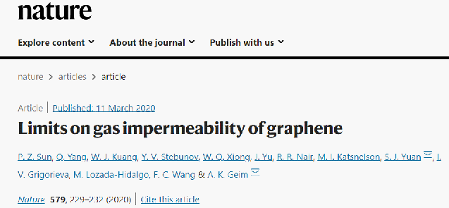 2. P. Z. Sun, et al. Limits on gas impermeability of graphene. Nature, 2020, 579, 229.