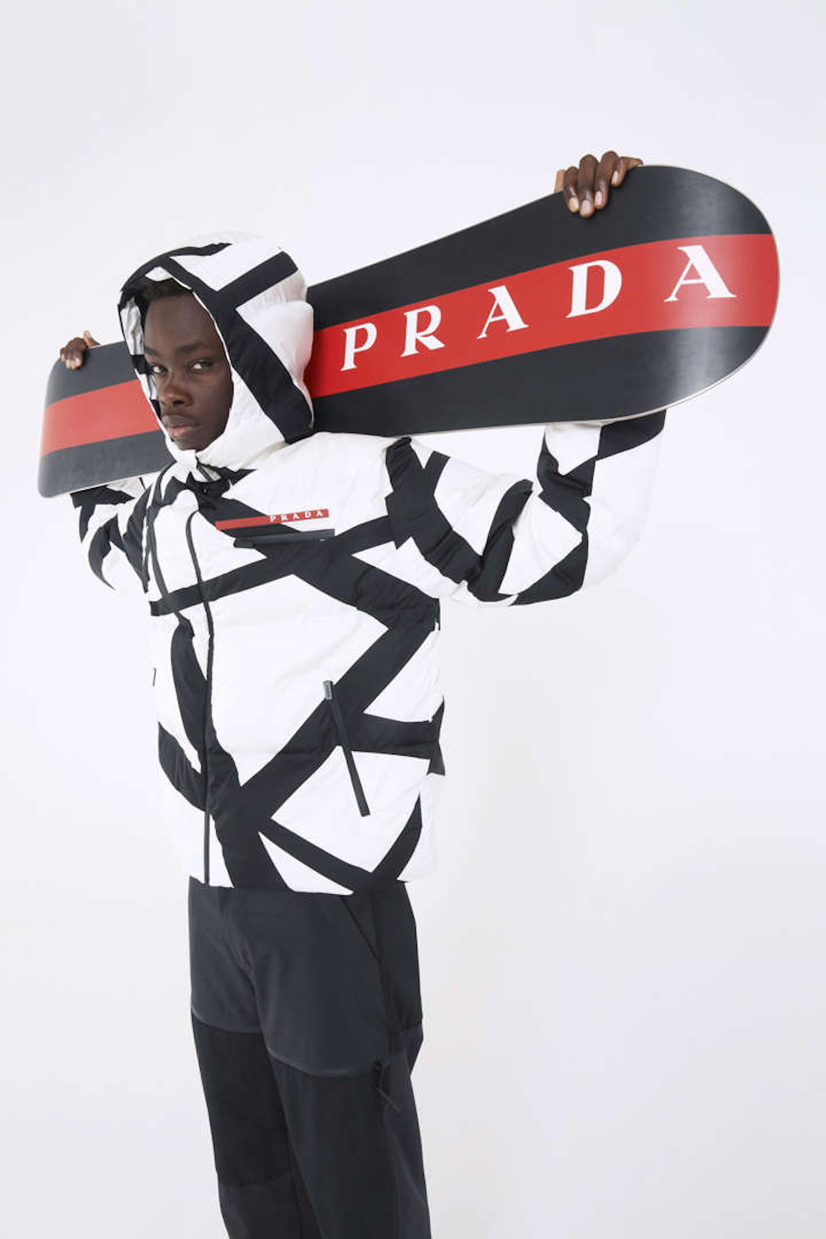 这款六件套高性能外套将Prada Linea Rosso的Extreme-Tex防水层与石墨烯衬垫相结合,可调节体温,以及艺术家Paula Crown的独特图形黑白设计。