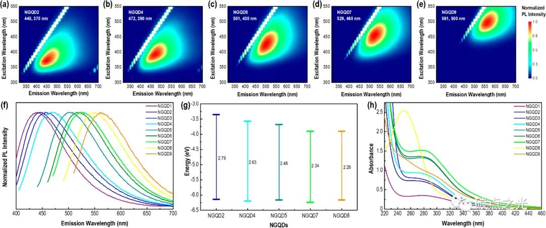 图1.合成的NGQDs的光学性质及其相应的能级。(a)NGQD2、(b)NGQD4、(c)NGQD5、(d)NGQD7和(e)NGQD9的PL图谱。(f)所有合成的NGQDs在不同激发波长下最大荧光发射光谱。(g)HA、MSA、LA、AA和AsA处理60min的样品的能量水平,分别来自UPS和相应HOMO和LUMO水平的最大PL发射。(h)所有合成的NGQDs的吸收光谱。