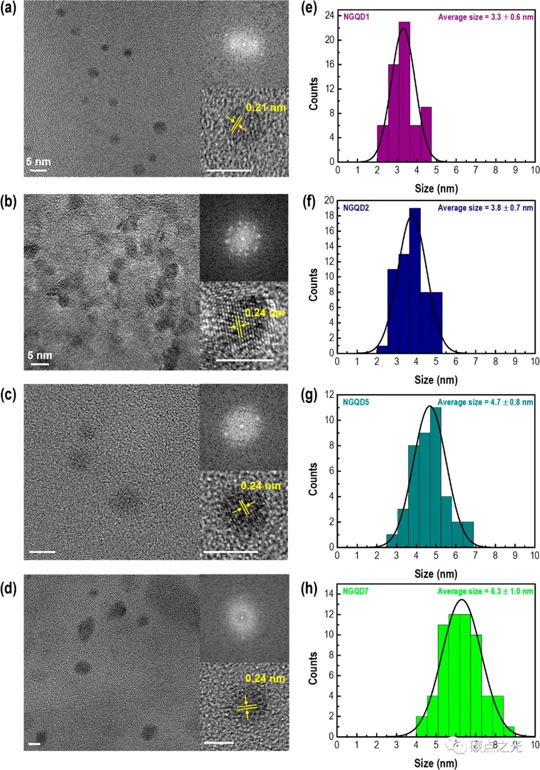 图2.透射电子显微镜图像和合成的NGQD的相应尺寸分布。(a)NGQD1、(b)NGQD2、(c)NGQD5和(d)NGQD7的低(左)和高(右下)倍率TEM和相应的FFT图像(右上)。(e)NGQD1、(f)NGQD2、(g)NGQD5和(h)NGQD7的尺寸分布直方图符合标准正态分布。