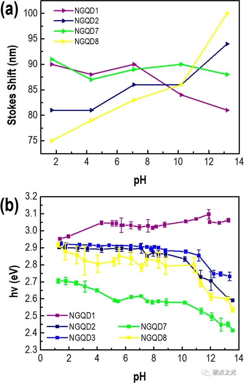 图3.不同pH值下NGQDs的斯托克斯位移和带隙研究。(a)不同量子点在不同pH下的斯托克斯位移和(b)禁带能。