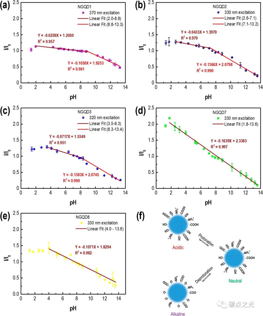 图4.不同酸处理的NGQDs的pH传感性能。(a)NGQD1、(b)NGQD2、(c)NGQD3、(d)NGQD7和(e)NGQD8的PH值传感性能。(f)说明在酸性和碱性条件下官能团的质子化和去质子化。
