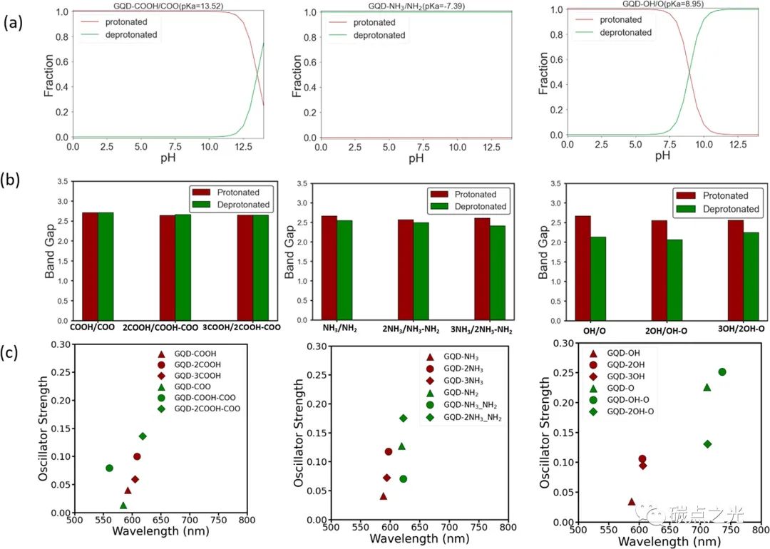 图5.GQD的质子化/去质子化效应。(a)GQD-COOH/COO、GQD-NH3+/NH2和GQD−OH/O体系的质子化和去质子化体系的pH值。(b)显示去质子化时带隙变化的曲线图(c)−COOH、−OH和−NH3+。