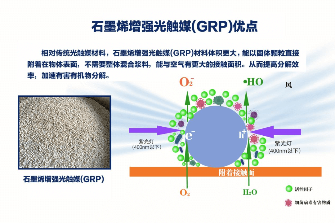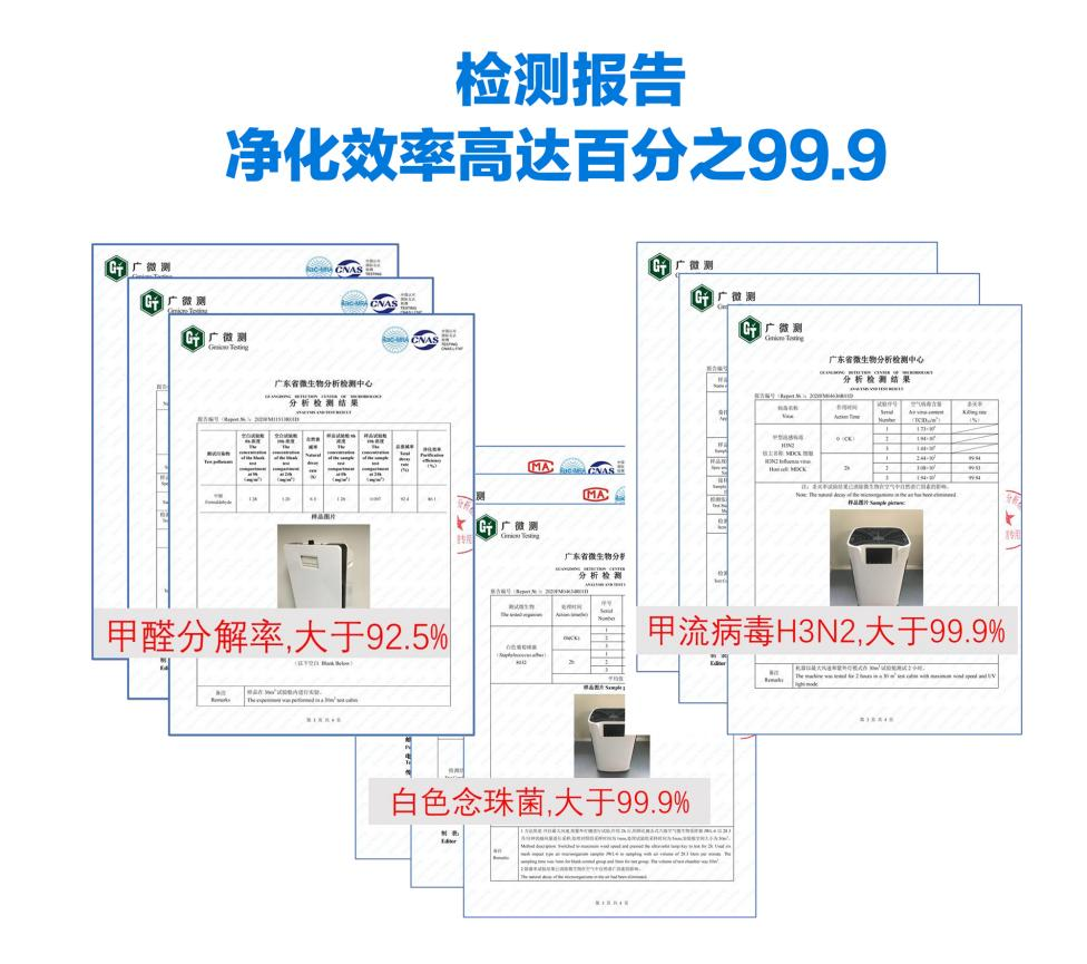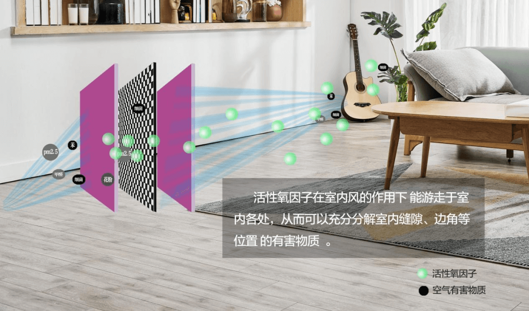 高效复合滤网搭配石墨烯增强光触媒(GRP),能对室内空气进行彻底高效的净化,净化分解室内苯、甲醛、VOC、二甲苯、烟味等有害有机物,并能高效杀菌,去病毒。
