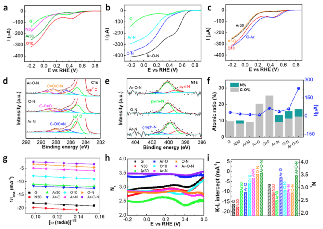 要点2. 进一步的结构-活性关系研究表明,氧和氮掺杂的总原子比与掺杂石墨烯的增强活性成正相关。具体而言,石墨烯中的含氧空位缺陷作为有效的4e−还原和增强的ORR活性的中心,可以通过改变掺杂体系的电子性质来进一步提高氮掺杂石墨烯的活性。