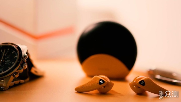 打开包装、斜坡式的设计把耳机的主体和项链展示的非常全面,耳机充电仓主体的黑色、橙色的拼色非常的高端,我觉得这个橙色与爱马仕橙非常相近,也是我认为它是”耳机中的爱马仕”的一个原因。环绕耳机的是黑色的金属项链,搭配白色的甘蔗再生纸,给人的视觉感受就非常棒。
