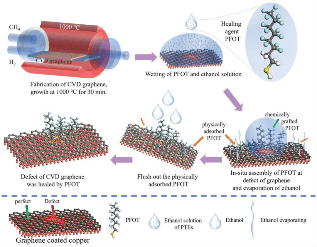 近日,中科院宁波材料所黄良锋,赵文杰等相关研究人员设计了一种准确的方法,可以在 15 分钟内有效地修复石墨烯涂层上的多尺度和多类型缺陷,从而可以显著提高石墨烯涂层 Cu 的耐腐蚀性。1H,1H,2H,2H-全氟辛硫醇(PFOT)分子的原位组装可以通过Cu─S键准确接枝到铜基板的缺陷位点,CF3─CF2─的疏水基团可以最大限度地减少腐蚀性溶液的润湿,这两者都会增强石墨烯涂层铜的防腐性能。