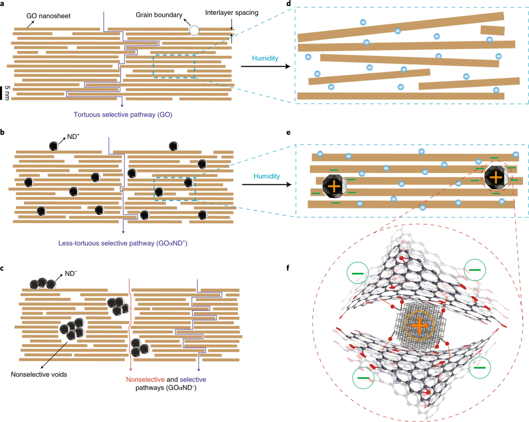 这项研究明确针对GO膜的静电稳定性,在保持高的氢气净化性能的同时,不受不良的湿度影响。本文假设带正电的纳米金刚石(ND+s)应该补偿水合GO片之间的静电斥力,并抑制暴露在湿度下的GO层的解体和分层(图1)。为了验证这一假设,本文使用不同的相对浓度(GO/填料)和GO薄片大小,在化学相似或不同的填料(正负电荷)存在的情况下制备了GO基层压板。然后,本文在分子和宏观水平上考察了所得膜在干燥和具有挑战性的潮湿条件下分离氢气的操作能力和稳定性。总之,本文发现具有独特的SP3/SP2核/壳结构的带正电的纳米金刚石(ND+)增强了GO膜的结构完整性,增加了GO膜在湿H2/CO2和H2/O2分离中的应用潜力。