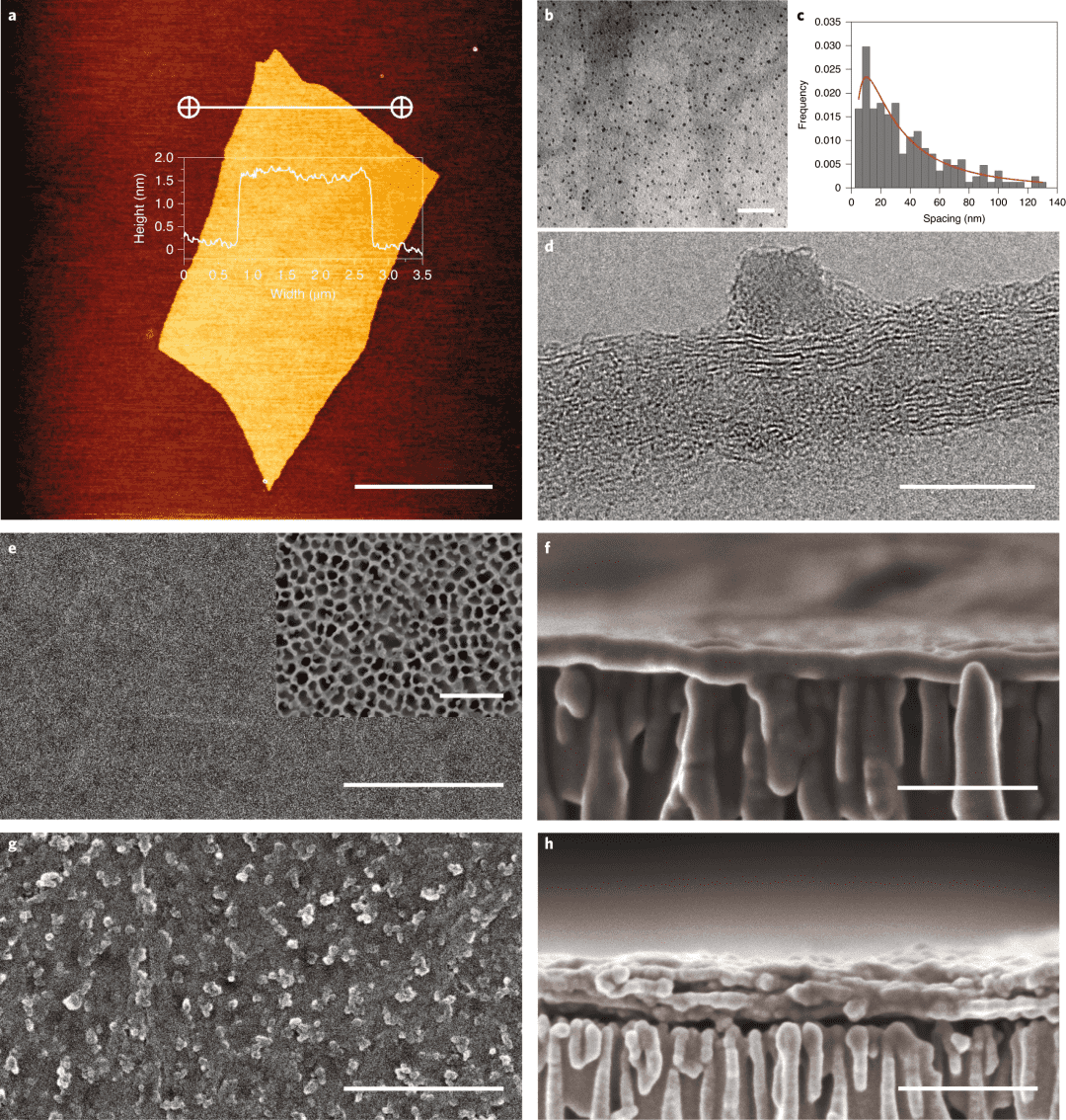 3. 本文还用扫描电子显微镜和原子力显微镜成像测试了GO和GO-αNd+膜的形貌。GO膜的表面相对光滑,没有明显的缺陷。然而,随着ND+粒子的加入,表面粗糙度增加(图2e-h)。