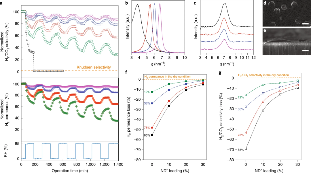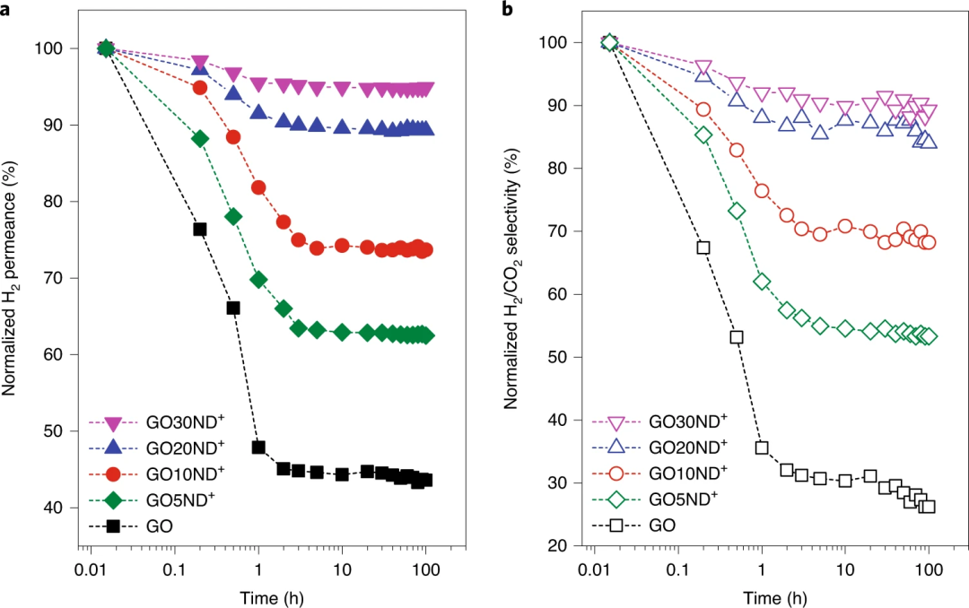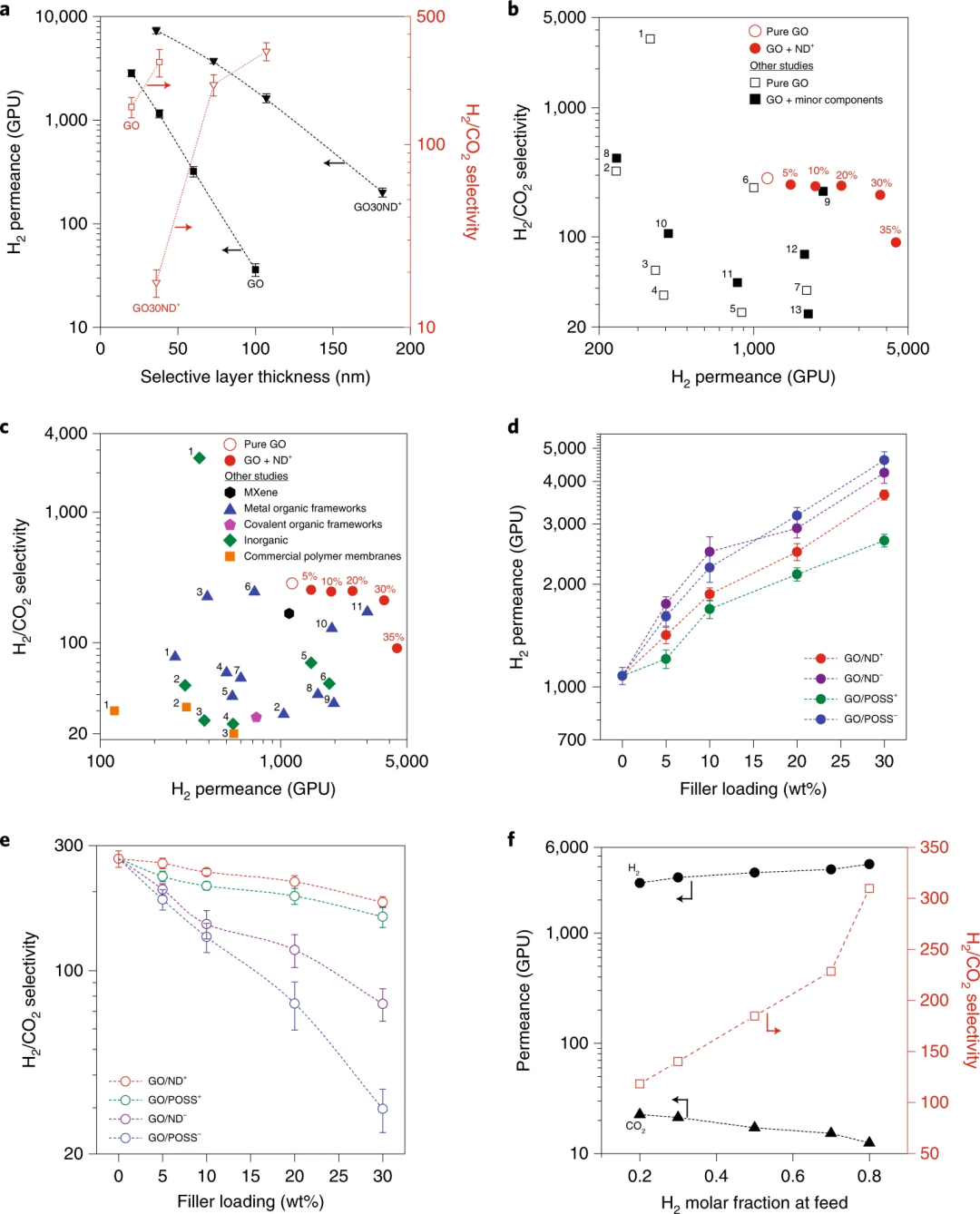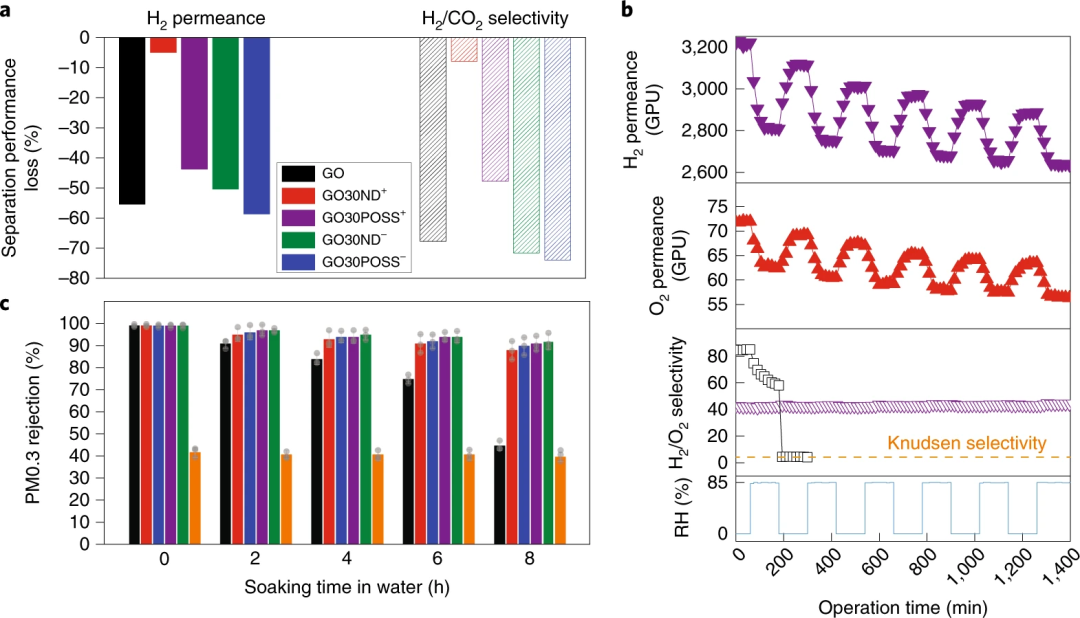 本文展示了将带正电的纳米金刚石(ND+s)加入到GO纳米层状物中,从而制备出耐湿、高性能的膜。虽然原生GO膜在一次运行中失效,但GO/ ND+复合材料在激进的湿度测试下经过几次循环后,对CO2的选择性仍保持在GO的大约90%。在GO中加入带负电荷的ND没有带来这样的稳定性,这表明电荷补偿是赋予耐湿性的主要机制,其中ND+s中和了GO薄膜中的负电荷。本文观察到当带正电的笼型聚倍半硅氧烷(polyhedral oligomeric silsesquioxane,POSS)取代ND+时也有类似的稳定效果,但效果较差。本文展示的材料平台提供了一种解决方案,可以将氢气从化石燃料来源或水分裂产生的潮湿混合物中分离出来。