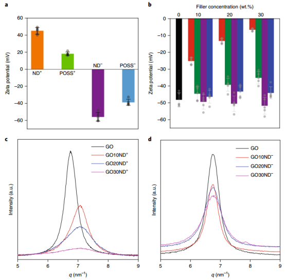 在确认ND+s可以稳定GO膜性能的基础上,对ND+粒子与GO膜的相互作用进行了详细的研究。当pH为7时,ND+粒子带正电荷(+45 mV),而GO片带净负电荷(−48 mV)(图4a、b)。因此,可以推测ND+通过较强的静电相互作用正确地组装到GO结构中。尽管ND+s改变了GO层压板的堆积顺序,但复合膜仍然保持完好,这主要是由于GO片与ND+粒子之间的静电相互作用和氢键作用。