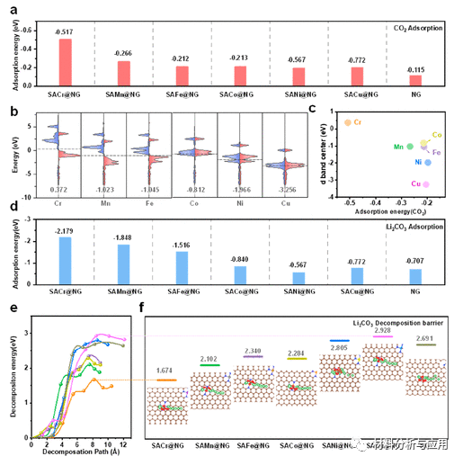 图1. (a)CO2在SACr@NG 、SAMn@NG 、SAFe@NG 、SACo@NG 、SANi@NG 、SACu@NG和 NG表面的吸附能。(b) Cr、Mn、Fe、Co、Ni和Cu的pDOS;插入的灰色虚线是d波段中心。(c) d带中心与 CO 2吸附能之间的关系。(d)Li2CO3在SACr@NG , SAMn@NG , SAFe@NG , SACo@NG , SANi@NG , SACu@NG表面的吸附能。(e) Li2CO3在SACr@NG 、SAMn@NG 、SAFe@NG 、SACo@NG 、SANi@NG 、SACu@NG和 NG 上的分解能垒和 (f) 详细分解路径。