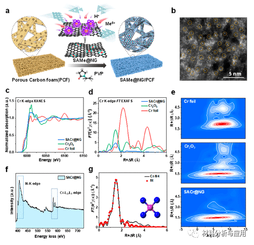 图2. (a) SAMe@NG /PCF合成示意图。(b) SACr@NG /PCF的AC- HAADF -STEM 图像。(c) K边X射线吸收近边结构 (XANES),(d)FT-EXAFS 光谱,(e) Cr 箔、Cr2O3和SACr@NG的Cr WT-EXAFS图样品。(f) SACr@NG 的EELS 光谱。(g) SACr@NG在 R 和 K 空间对应的 EXAFS 拟合曲线;插图显示了一个示意图模型。