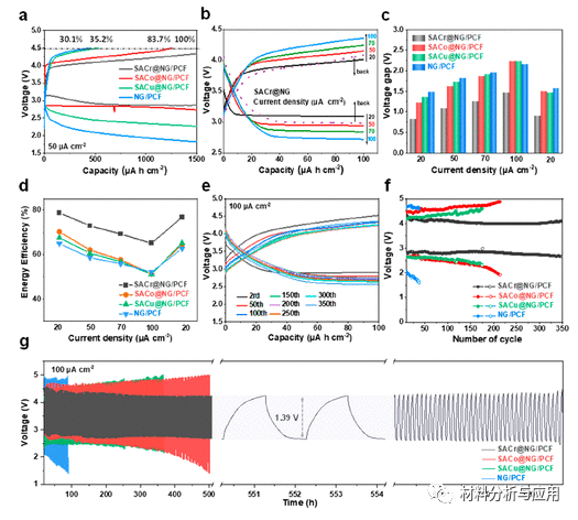 图3. (a)电流密度为 50 μA cm –2 时容量为 1500 μA h cm –2的阴极的恒电流放电和充电曲线。(b) SACr@NG /PCF正极在不同电流密度下的放电/充电曲线。(c-g)SACr@NG /PCF、SACo@NG /PCF、SACu@NG /PCF和NG/PCF在不同电流密度下的电压间隙和能量效率。放电和充电曲线SACR @ NG选定周期/ PCF,放电和充电电压和时间-电压在100μAcm 2的电流密度的四个阴极的曲线-2具有有限100 μA h cm –2 的容量。