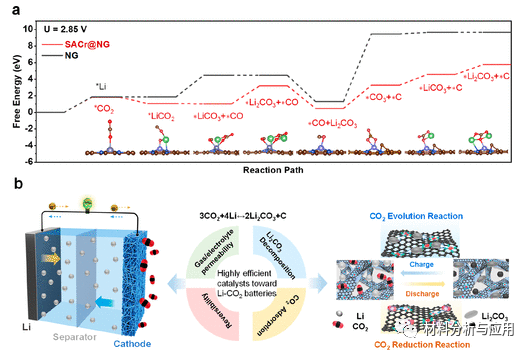 图4. (a) U=2.85V时Li-CO2电池反应途径的吉布斯自由能图。(b) Li-CO2电池中SACr@NG /PCF的图示。