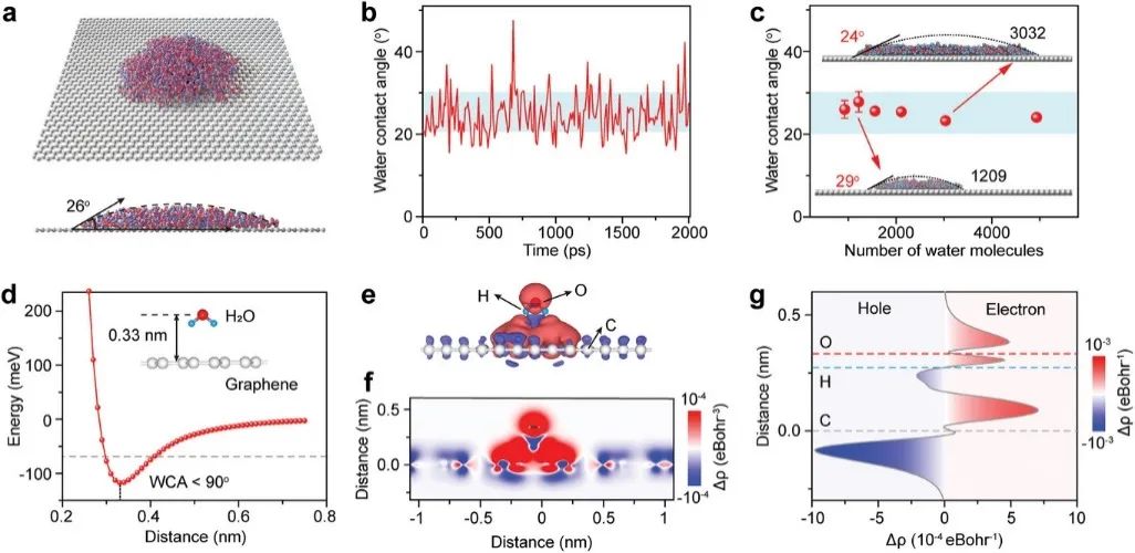 作者进行了分子动力学和第一性原理模拟以研究水-石墨烯相互作用来揭示石墨烯的润湿性。在分子动力学模拟中,通过拟合半球形水滴,作者获得了模拟 的水接触角,其平均值约为26°,与实验结果一致。同时,通过改变模拟温度或水分子数,没有观察到水接触角的明显变化,这表明水滴的大小和温度不会显著影响石墨烯的润湿行为。作者进一步通过第一性原理模拟以探测水-石墨烯的相互作用。结果发现,水分子在石墨烯上的最大吸附能为-117.5 meV,这与观察到的石墨烯的高亲水性一致。作者随后分析了水-石墨烯系统中相应的电荷分布,研究发现电子从石墨烯的π带转移到水分子中的 H 原子,导致H-π相互作用的形成,这导致了石墨烯的固有亲水性。