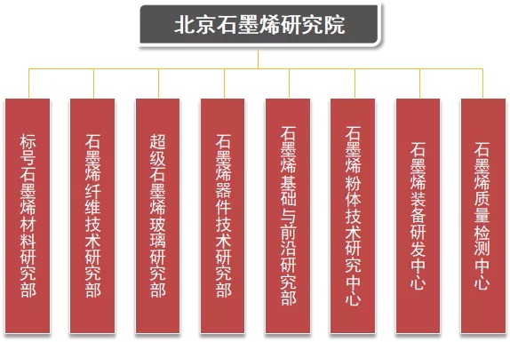 北京石墨烯研究院(BGI)主要包含标号石墨烯材料研究部、石墨烯纤维技术研究部、石墨烯器件与应用技术研究部、石墨烯装备研发中心、石墨烯质量检测中心等。