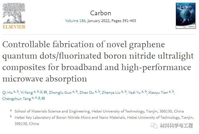 近日,来自河北工业大学的唐成春教授、房毅副教授等人在《Carbon》上发表了题为“Controllable fabrication of novel graphene quantum dots/fluorinated boron nitride ultralight composites for broadband and high performance microwave absorption”的文章,此项工作可以为新型微波吸收材料的开发提供新的可行性思路。