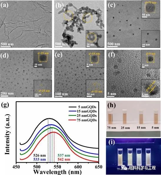 图1.(a) GO;(b)未成形的GQDs和 (c-f) 不同尺寸GQDs的TEM图像;(g)GQDs在水中(450 nm)的PL光谱;(h,i) 自然光和紫外光(365 nm)下的GQDs。