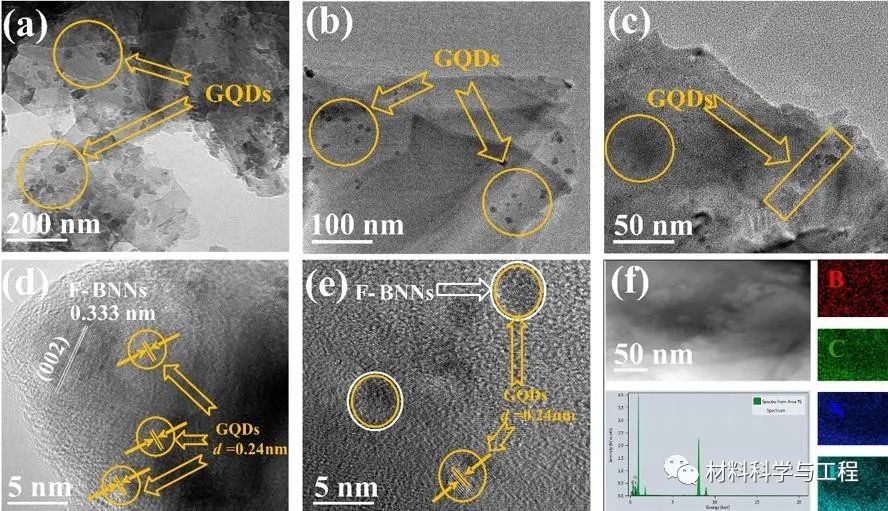 为了获得具有优异微波吸收性能的材料,将不同尺寸的GQDs 与氟化BNNs复合。在水热反应后,不同尺寸的GQDs均可均匀地加载在F-BNNs上(图2a-e)。GQDs和F-BNNs的晶面相互重叠,晶格条纹非常明显,证实B、C、N、F元素分布的均匀性。