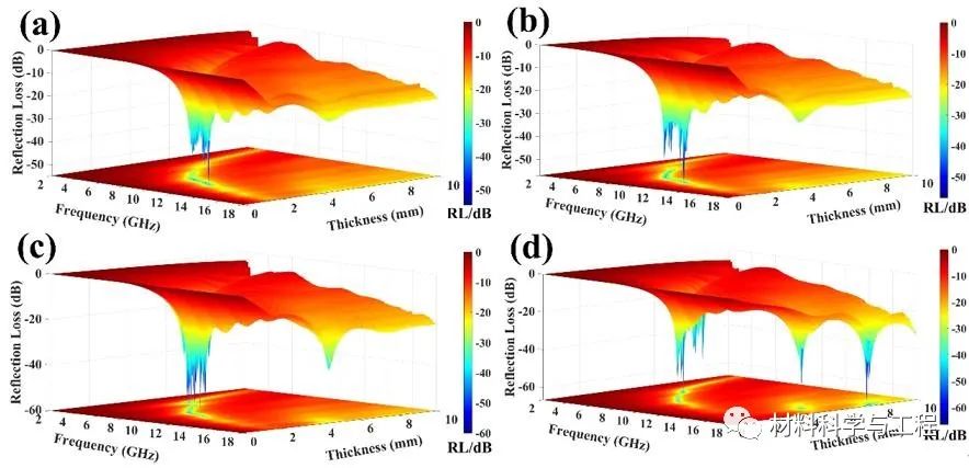 图3.(a-d) S1、S2、S3和S4在2~18 GHz频率范围内的三维RL图像。