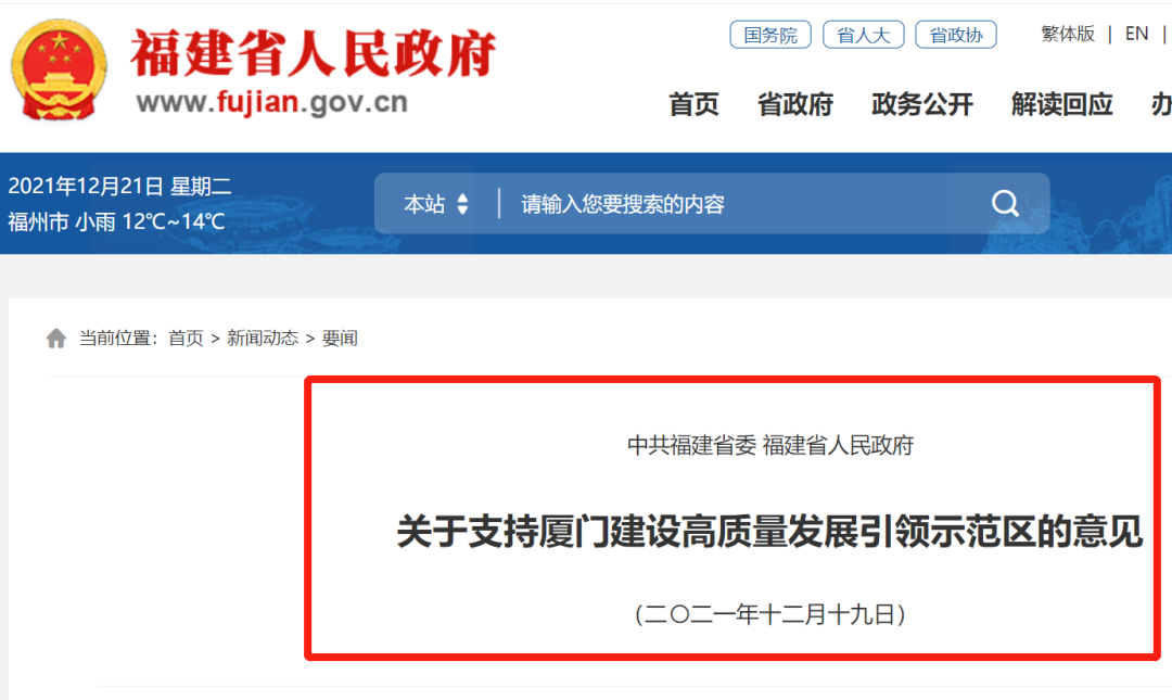 12月19日,福建省委、省政府出台《关于支持厦门建设高质量发展引领示范区的意见》(以下简称“《意见》”),进一步弘扬特区精神,支持厦门当好改革开放先锋,进一步建设好高素质高颜值现代化国际化城市,打造高质量发展引领示范区。