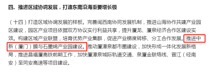 《意见》第四点“推进区域协调发展,打造东南沿海重要增长极”中提到,“(十四)打造区域协调发展的样板……推进中新(厦门)膜与石墨烯产业园建设。”