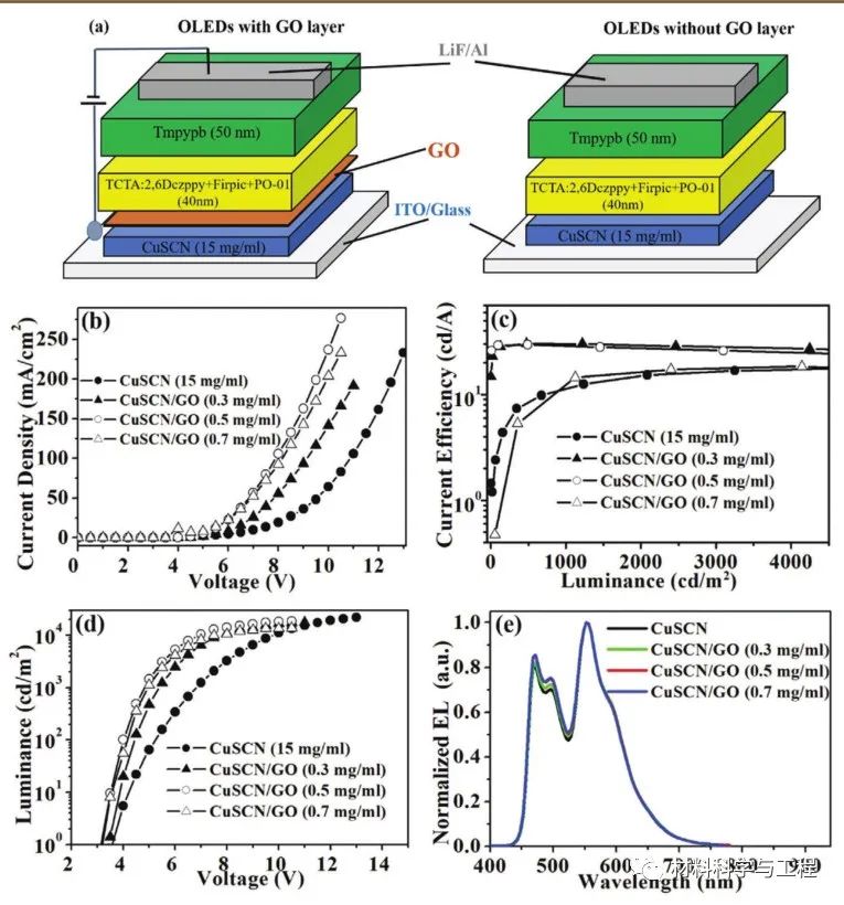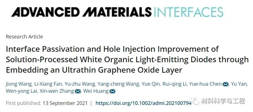 南京邮电大学、西北工业大学等单位的研究人员在空穴传输层(HTL)和发射层(EML)之间插入超薄氧化石墨烯(GO)层作为钝化层。EML的时间分辨光致发光光谱直观地证明了GO对激子猝灭的抑制作用。此外,紫外光电子能谱和阻抗谱表明,超薄GO层还可以增加HTM的功函数,促进空穴注入。相对于没有GO层的设备,含有CuSCN/GO的设备的效率从18.1 cd A−1提高至30.3 cd A−1,并且具有NiO x/GO的器件可将功率效率从10.1 lm W提高到20.0 lm W−1.相关论文以题目为“Interface Passivation and Hole Injection Improvement of Solution-Processed White Organic Light-Emitting Diodes through Embedding an Ultrathin Graphene Oxide Layer”发表在Adv. Mater. Interfaces期刊上。