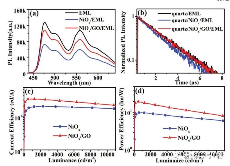 图3。a)EML、NiOx/EML和NiOx /GO/EML的PL光谱和b)时间分辨PL衰减曲线。c)电流密度–亮度特性和d)功率效率。