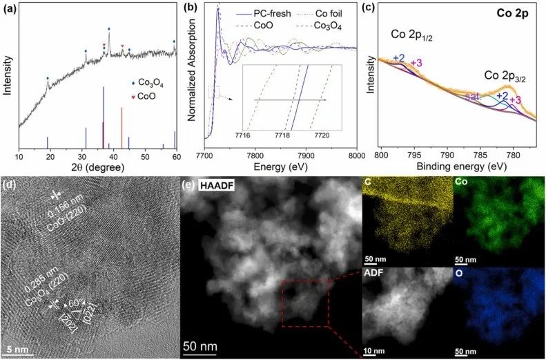 图1. 本文制备的光催化剂的(a)XRD,(b)XANES, (c) XPS, (d) HRTEM 和 (e) HAADF及 ADF/EDS