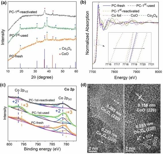 图3,本文催化剂使用和活化后的(a)XRD,(b)XANES, (c) XPS, (d) HRTEM(左:使用后,右:活化后)