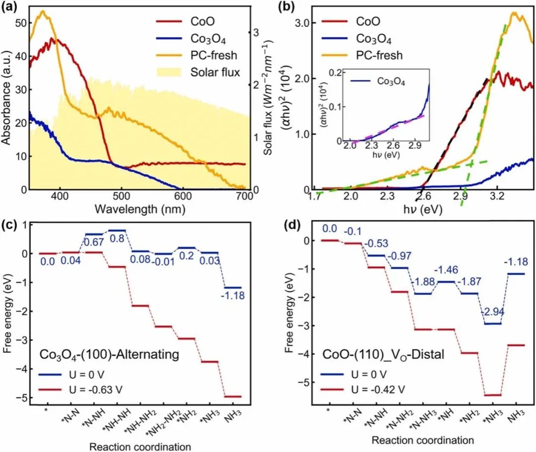 图4, (a), (b)CoO,Co3O4以及RGO上沉积的未参与反应的钴氧化物(PC-fresh)的光吸收谱,对应的Tauc plot。(c), (d) Co3O4和CoO表面催化NRR反应的能垒