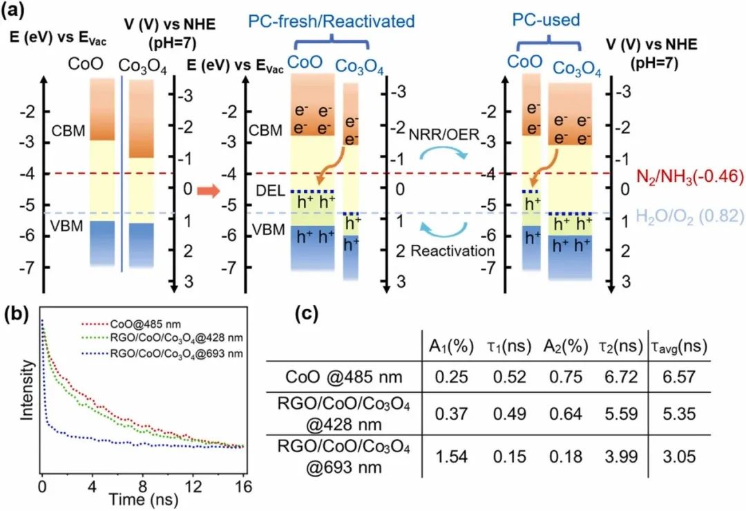 计算的态密度和实验观测到的载流子寿命以及催化NRR反应的能垒等结果表明CoO和Co3O4之间形成Z-型异质结构,CoO导带电子参与NRR反应,Co3O4价带空穴参与OER反应。