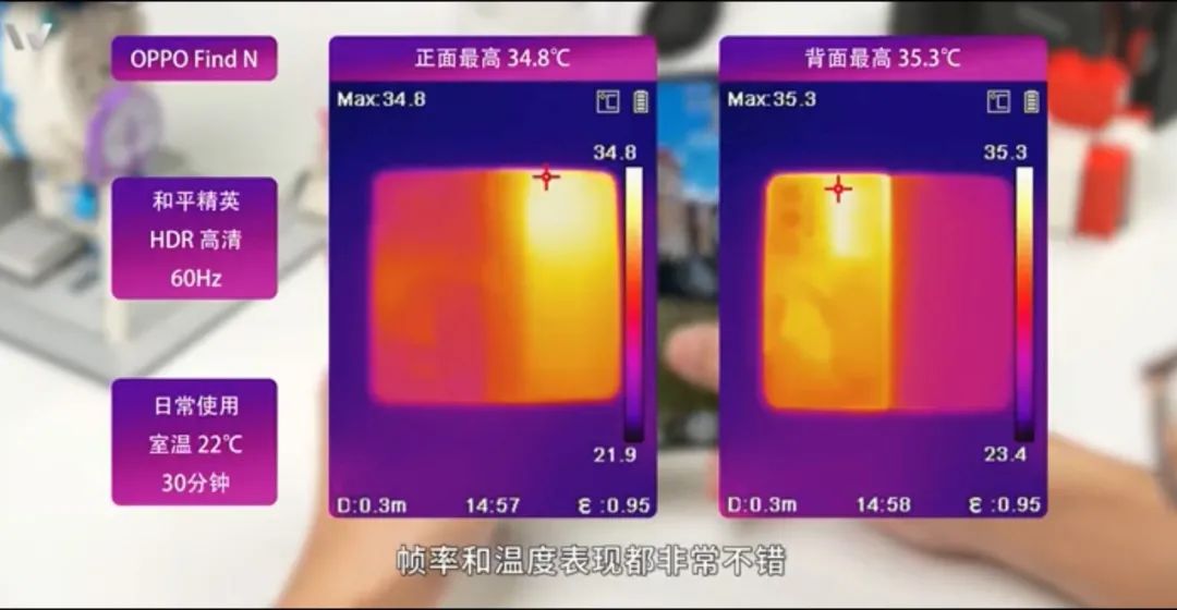 - 在22℃室温环境下,《和平精英》测试(@楼斌Robin),HDR+60Hz设置下,半小时游戏后, Find N机身正面最高温度为34.8℃,背面最高35.3℃,整体温控表现非常不错。