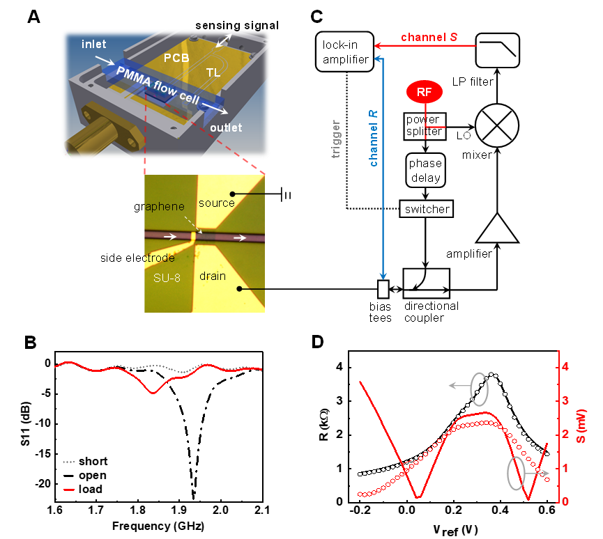 图1 (A) 超高频(UHF)石墨烯芯片的组装和测量。(B) UHF反射式测量结果。(C) UHF石墨烯生物传感装置可同时测量石墨烯电阻信号(R)和UHF反射信号(S)。(D) 电解质门控引起的石墨烯电阻R和UHF反射信号S的变化。