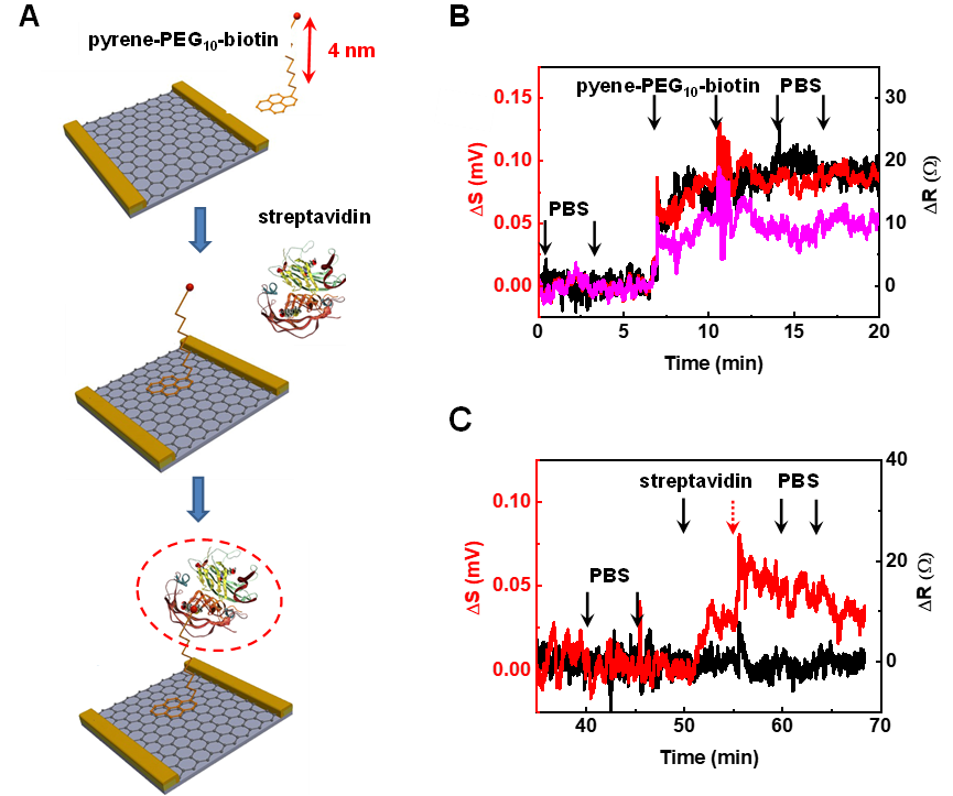 图2 (A) 石墨烯表面首先通过芘环经由较长的乙二醇链(PEG10〜4nm)与生物素(由红点表示)偶联,然后引入链霉亲和素与生物素分子紧密结合。(B) 芘环通过π-π相互作用固定在石墨烯表面后,电阻(黑线)、UHF传感信号(红线)和UHF介电调制传感信号(紫线)都出现了变化。(C) 引入与生物素结合的链霉亲和素后,只在介电调制的UHF传感信号中检测到变化,基于传统检测方法的电阻信号则由于德拜屏蔽无法检测到这一结合。