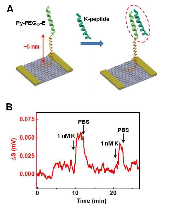 图3 (A) 石墨烯表面首先通过芘环经由较长的乙二醇链(PEG12〜5nm)与多肽E(例如,(EIAALEK)3)偶联。(B) UHF石墨烯传感器在介电调制模式下,检测得到引入多肽K(即(KIAALKE)3)后其与多肽E的相互作用信号。