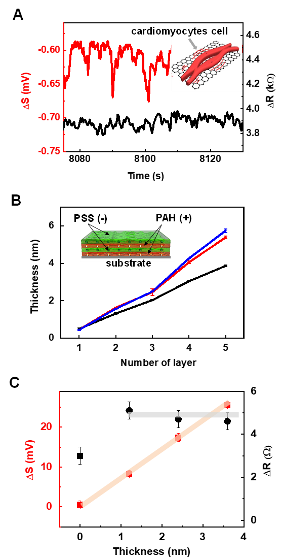 图4 (A)通过UHF介电调制信号监测心肌细胞收缩。(B)椭圆偏振仪测量聚电解质(PEM)在三种不同浓度的盐溶液(0.05 M,0.5 M和1 M)中厚度随自组装层数(见插图,交替PAH(+)/PSS(-)逐层自组装)的变化。(C) 传统电阻信号(ΔR,黑色圆点)和UHF介电调制信号(ΔS,红色方块)对比检测PEM的逐层自组装过程。