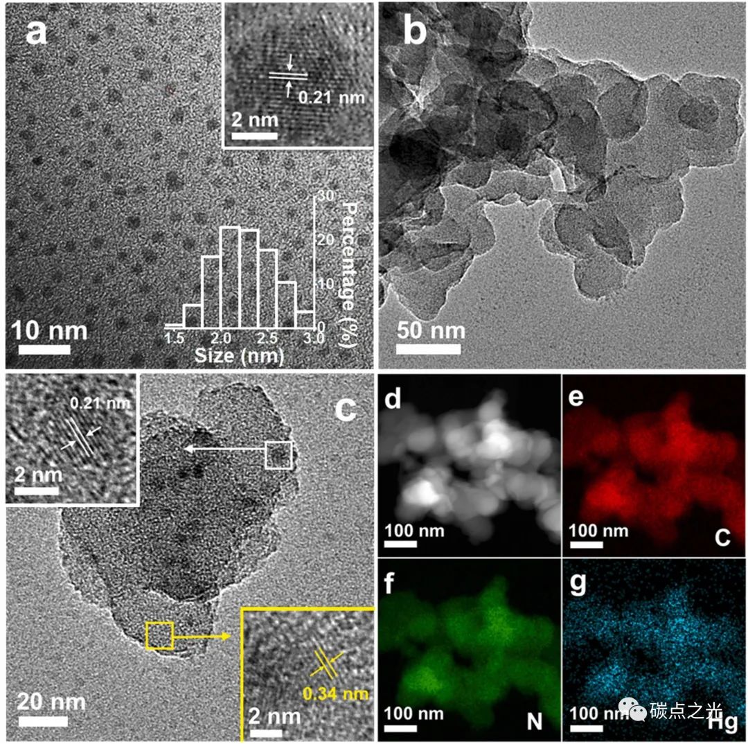 图1. (a) CDs的TEM、HR-TEM图像及尺寸分布图。CDs/HgL1的(b) TEM和(c) HR-TEM图像。(d) CDs /HgL1中(e) C、(f) N和(g) Hg元素的HAADF-STEM元素和元素映射图。