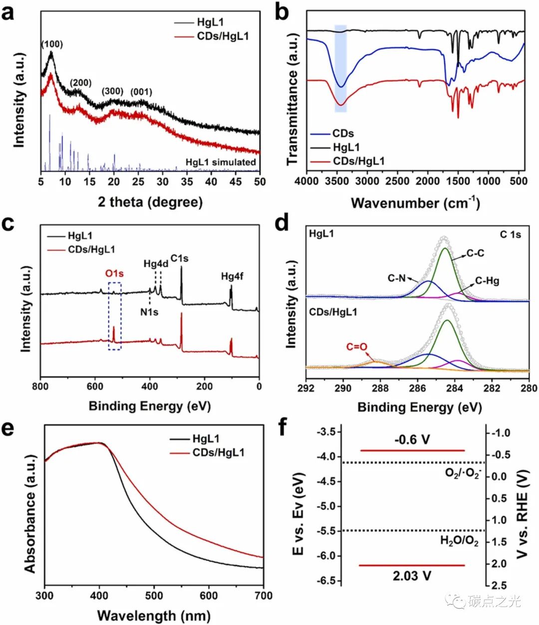 图2. (a) HgL1和CDs/HgL1的XRD谱图。(b) CDs、HgL1和CDs/HgL1的红外光谱。HgL1和CDs/HgL1的(c) XPS测量和(d) C 1s光谱。(e) HgL1和CDs/HgL1的归一化UV-vis吸收光谱。(f)原始HgL1的能带结构图。